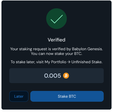 Once verification is complete, you’ll see a **"Verified"** confirmation modal — now you’re ready to stake your BTC.