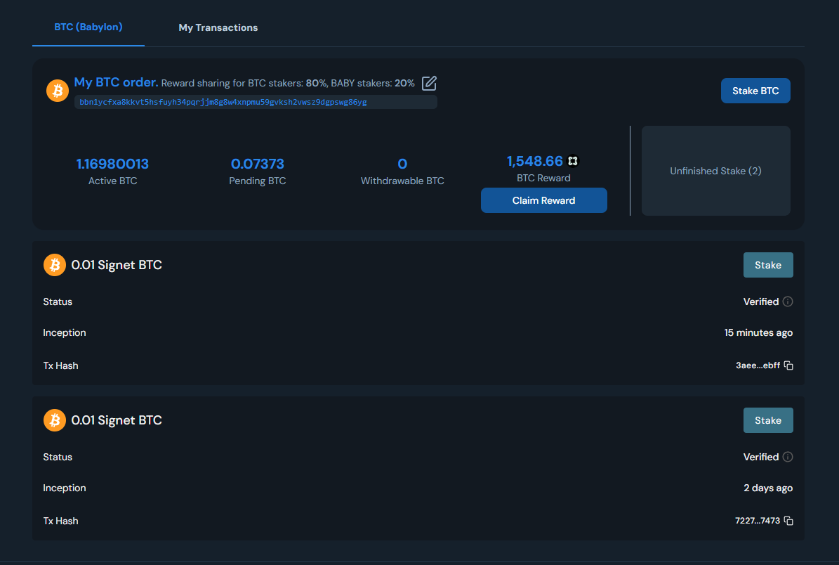 Click **Stake BTC** and sign the transaction in your BTC wallet.