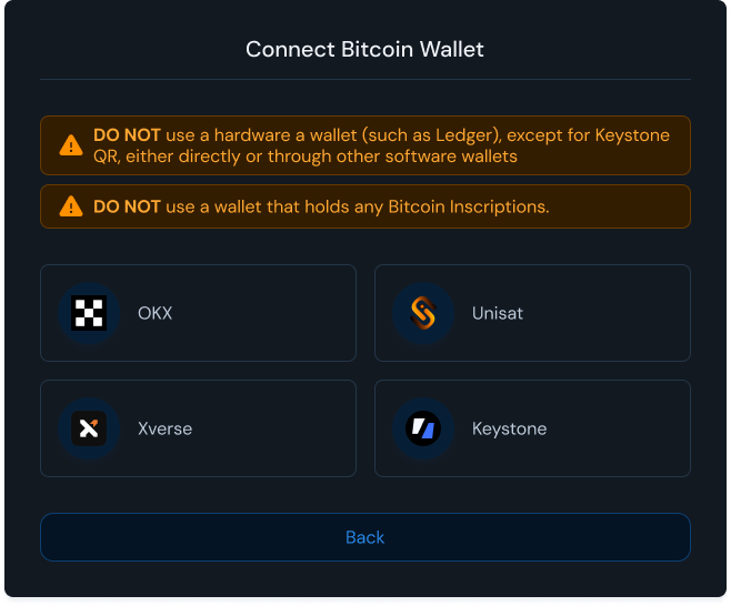 Supported Bitcoin Wallet Browser Extension: [Xverse](https://chromewebstore.google.com/detail/xverse-wallet/idnnbdplmphpflfnlkomgpfbpcgelopg?hl=en-GB\&authuser=1), [Unisat](https://chromewebstore.google.com/detail/unisat-wallet/ppbibelpcjmhbdihakflkdcoccbgbkpo), [OKX Wallet](https://chromewebstore.google.com/detail/okx-wallet/mcohilncbfahbmgdjkbpemcciiolgcge).