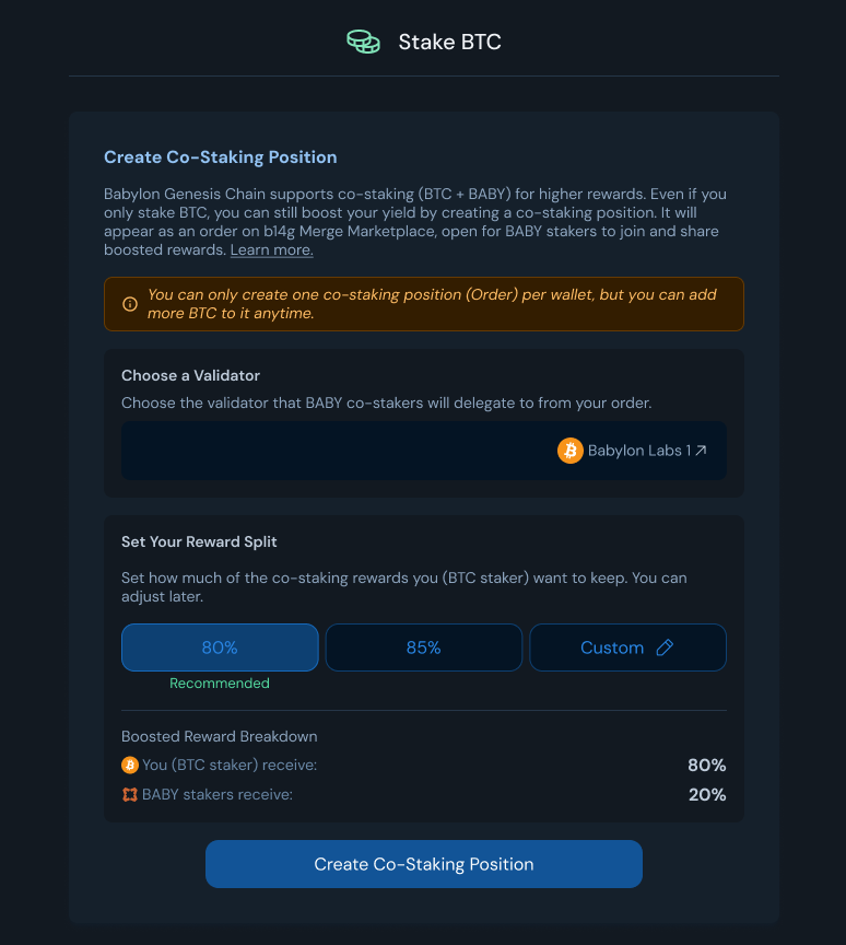 Once your staking transaction is finalized (after 30 block confirmations), your Order automatically becomes active on the b14g Merge Marketplace. It’s now open for BABY stakers to join and form a co-staking position with your BTC — unlocking boosted rewards for both sides.
