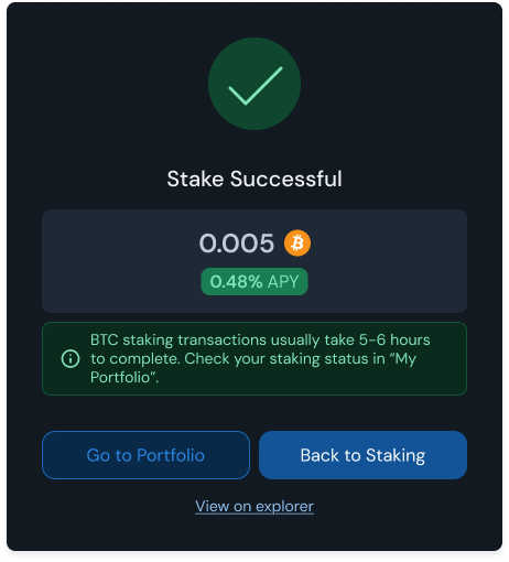 Once you see the **Stake Successful** modal, your BTC has been successfully broadcasted on the Bitcoin network. It will take **\~30 Bitcoin block confirmations** (\~5-6 hours) before your BTC stake becomes **eligible** for voting power, network security contribution, and yield.