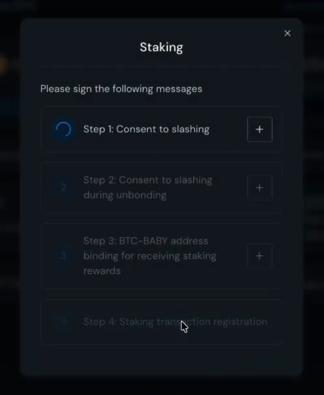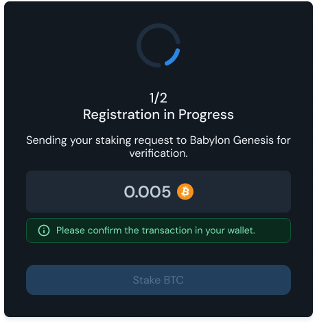 Next, a **staking registration modal** will appear. Confirm the transaction in your Babylon wallet to register your staking request onto Babylon Genesis.