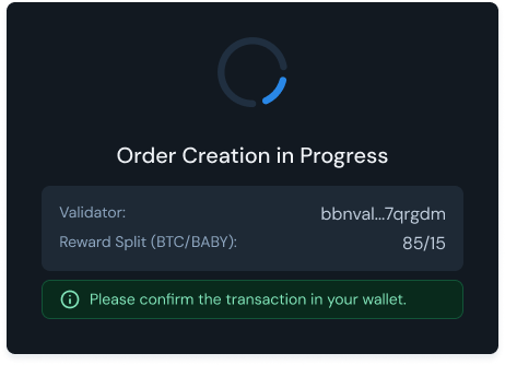You can create only **ONE order per Babylon wallet**. Any future BTC you stake will be automatically added to this existing order, so this step won’t be required again.