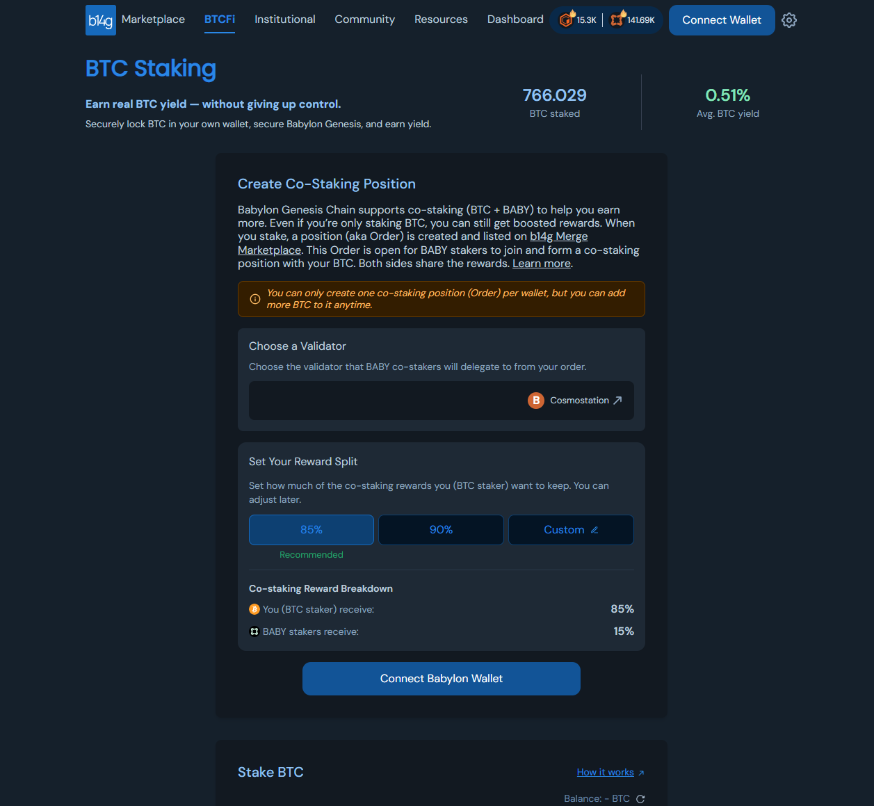 This guide walks you through how to stake BTC self-custodially on Bitcoin network and create a co-staking position on b14g Merge Marketplace for boosted co-staking rewards.