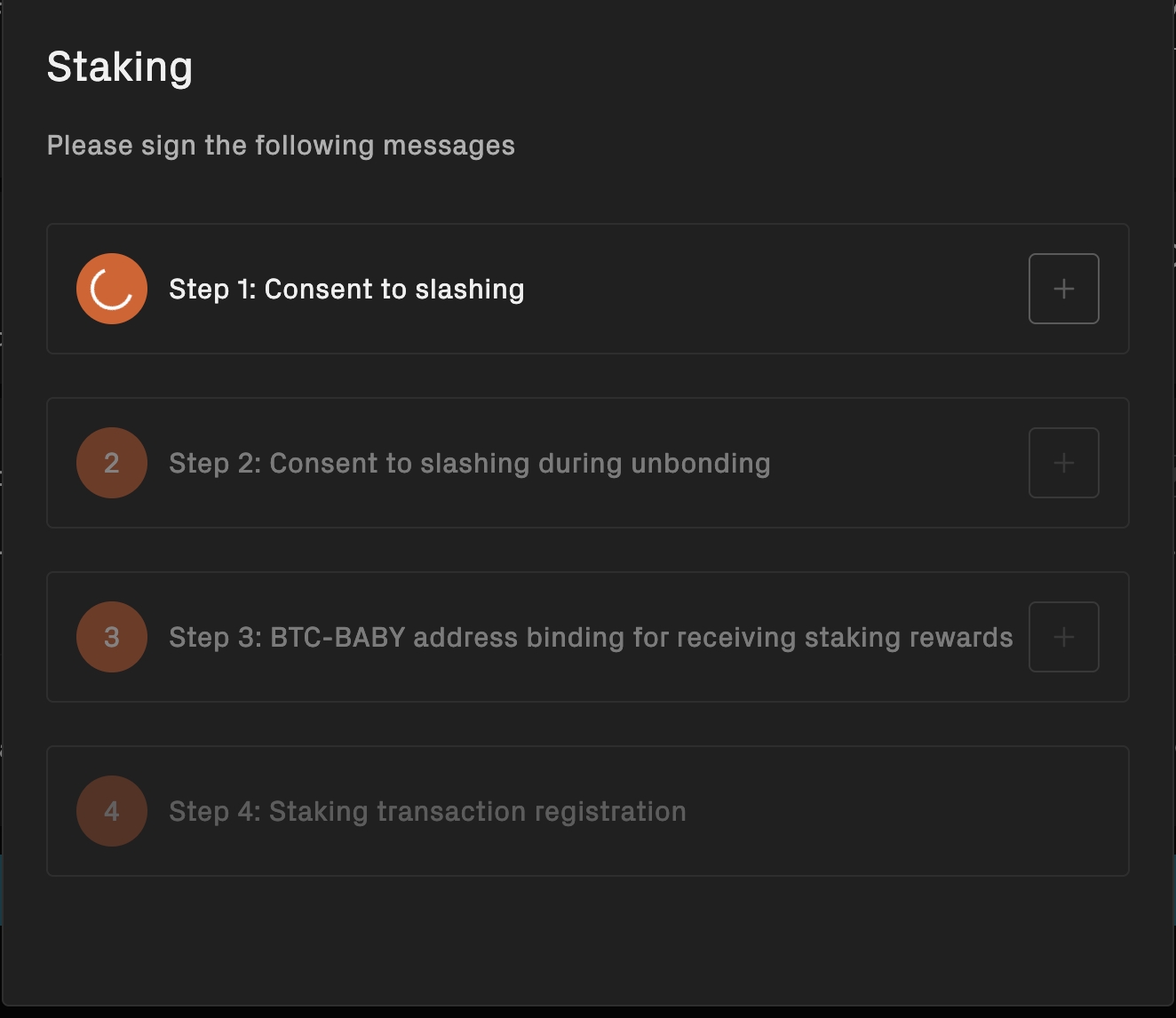 Next, a staking registration modal will appear. Confirm the transaction in your Babylon wallet to register your staking request onto Babylon Genesis.